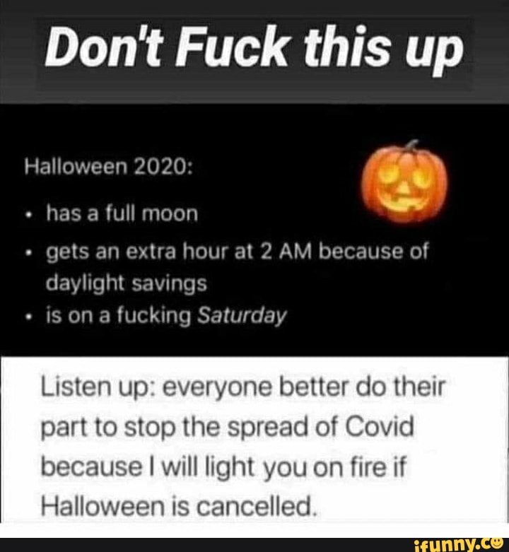 Don T Fuck This Up Halloween 2020 Y Has A Full Moon Gets An Extra Hour At 2 Am Because Of Daylight Savings Listen Up Everyone Better Do Their Part To Stop The