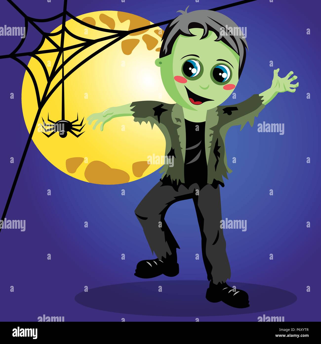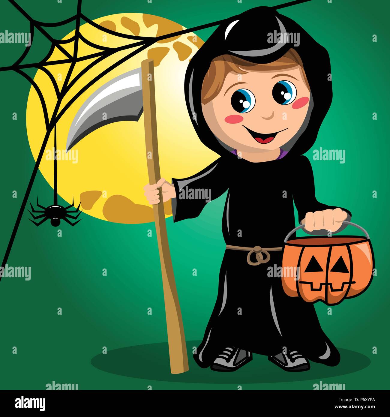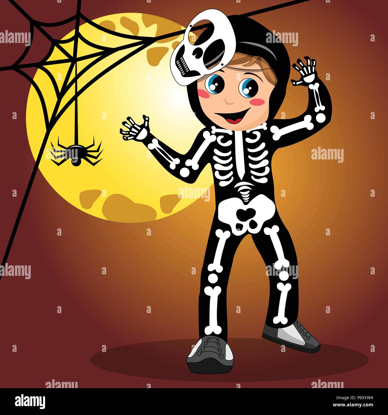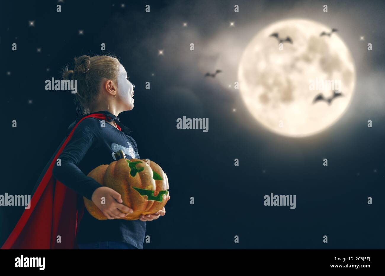 Happy Halloween Cute Little Skeleton With Pumpkin Beautiful Young Child Girl In Costume Looking At Full Moon Stock Photo Alamy