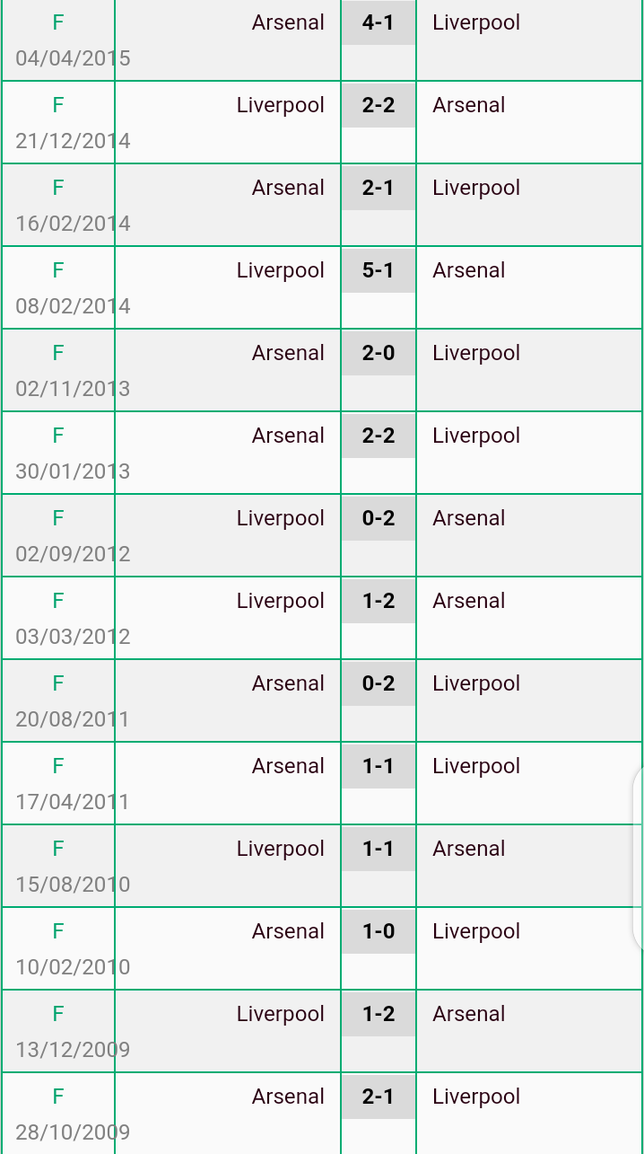 Liverpool Vs Arsenal Head To Head Results Records H2h