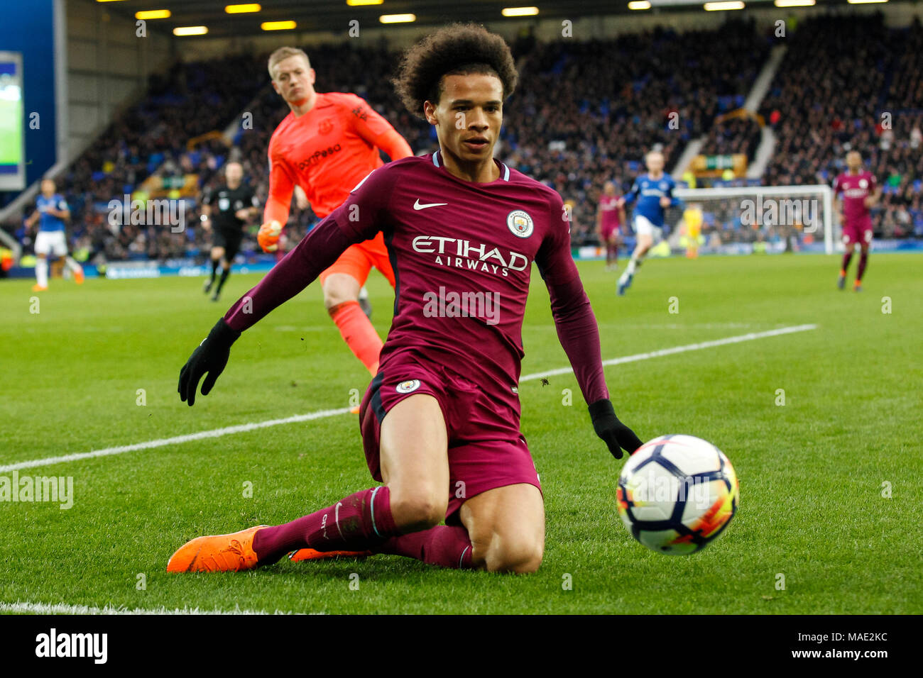 Leroy Sane Of Manchester City Attempts To Keep The Ball In Play During The Premier League