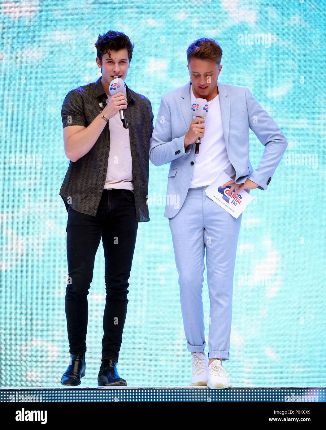 Roman Kemp And Shawn Mendes Left On Stage During Capital S Summertime Ball With Vodafone At Wembley Stadium London Stock Photo Alamy