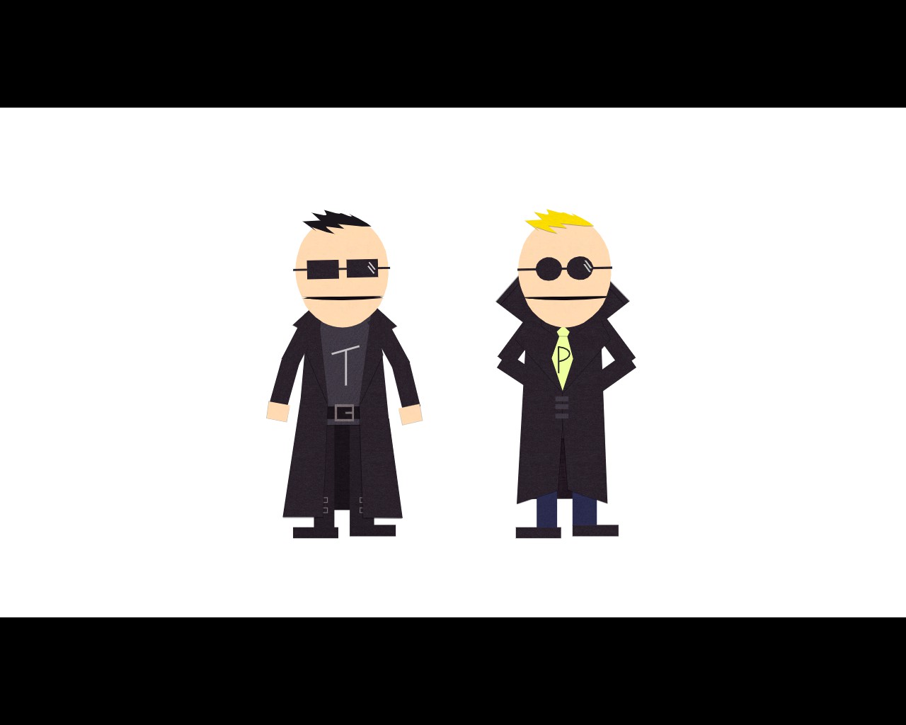 The terrance and phillip show halloween special. Towelie gives the boys. Terrance has black hair and wears a red shirt with a letter t while phillip has blond hair and a blue shirt with a p. As toys south park.